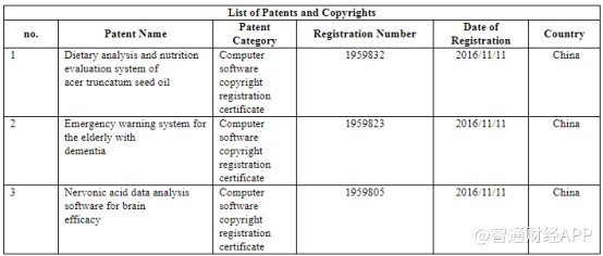值得注意的是,虽然宝枫生物强调公司具备国家实验室,还与知名医院合作,计划进行神经酸在不同医学领域的临床应用试验。但在公司招股书的专利申请披露中,仍以促销和产品和渠道的申请居多,且专利类别仅有2项为发明专利,其余均为计算机软件版权注册证书,说明该公司经营主要还是倾向于市场营销,公司发展以市场为导向。