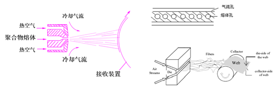 工艺原理就是用高速热空气对模头喷丝孔挤出的聚合物熔体细流进行牵伸,由此形成超细纤维并凝聚在凝网帘或滚筒上,依靠自身粘合成为非织造布,喷丝的原理如下图: