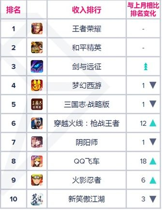 其中,《王者荣耀》继续霸占榜单第1名。《剑与远征》上升42名至第2。数据显示,自1月份《剑与远征》在中国上线后,其总收益已经达到了8830万美元。