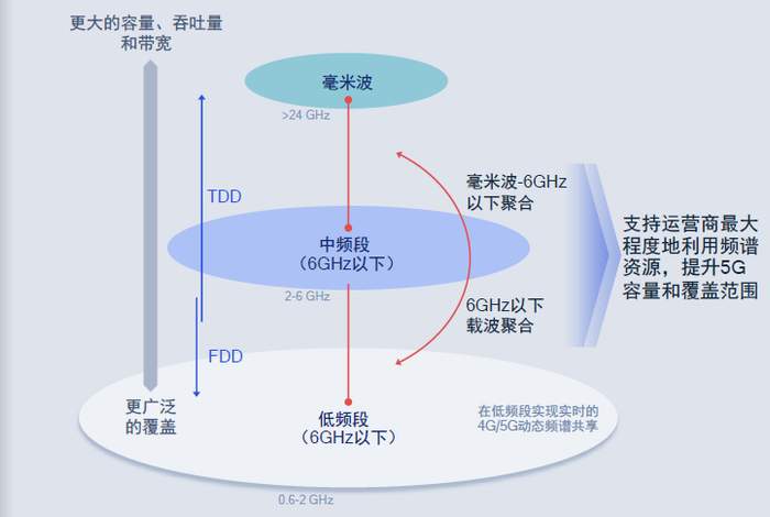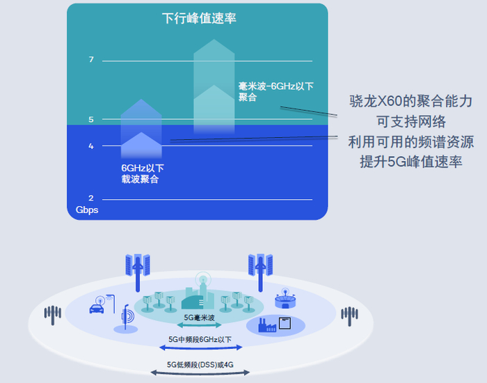 解释地更清楚一些,例如,借助动态频谱共享(DSS),运营商可以在已经用于LTE低频部署的FDD频段上部署5G服务。骁龙X60支持5G FDD-TDD载波聚合,从而使运营商可以增加网络容量和扩大覆盖范围。