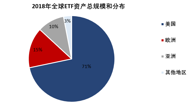 目前全球ETF市场规模为 4.7万亿美元、有超过6000只ETF产品,其中美国市场为全球最大和最成熟的市场。截至2018年底,美国的ETF规模高达3.4万亿美元,占全球ETF市场规模的71%,是全球ETF市场发展最繁荣,流动性最高之地。