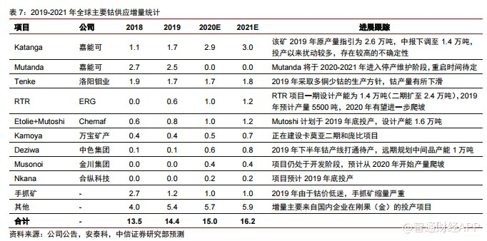 1)嘉能可旗下Katanga项目2020/2021年将增产至3.0/3.6 万吨,较2019年增加超过2 万吨;