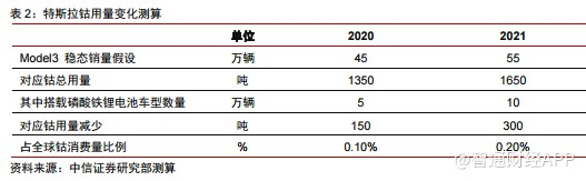 即使特斯拉电池技术路线切换,对钴用量影响较小。特斯拉当前车型中使用的电池正极材料中钴含量预计在3%(质量分数),按照每辆国产Model 3配套65kWh电池计算,10万辆Model 3对应的动力电池装机量约6.5GWh,需要正极材料(NCA 或 NCM811)约1万吨,对应钴用量300吨(金属量)。假设2020/2021年搭载磷酸铁锂的特斯拉车型数量分别为5万辆/10万辆,对应钴金属用量减少150/300吨,对全球钴消费影响较小。