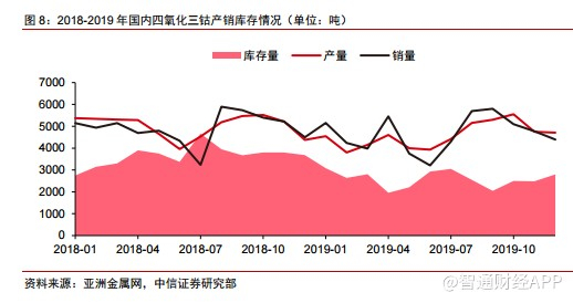根据亚洲金属网数据,2019 年下半年以来,国内四氧化三钴产品(主要用于生产钴酸锂,用于消费电子产品)产销量明显恢复,旺季月销量重回5500吨上方。同时,国内企业四氧化三钴的库存量也从2018年峰值时期的4500吨降至2500吨。四氧化三钴库存规模下降表明企业订单状况良好,下游采购活跃,反映出消费锂电市场的回暖。