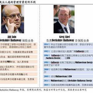 这两位倍受关注的候选人,分别通过不同的方式加入伯克希尔已有20年和30年以上,完全符合在2014年给股东信中所提到的“未来的执行官应该来自伯克希尔董事会已经熟识的内部候选人”这一要求。多年的工作经验和能力展现,使得巴菲特曾在不同场合对Ajit Jain和Greg Abel透露出赞许,但也始终未曾透露继任者的最终答案。从过去的职业路径来看,Ajit Jain和Greg Abel都有各自的优势,但也显示出不同的行事风格。我们认为,继任者最终的选择,或将与未来巴菲特对伯克希尔发展的方向相关。