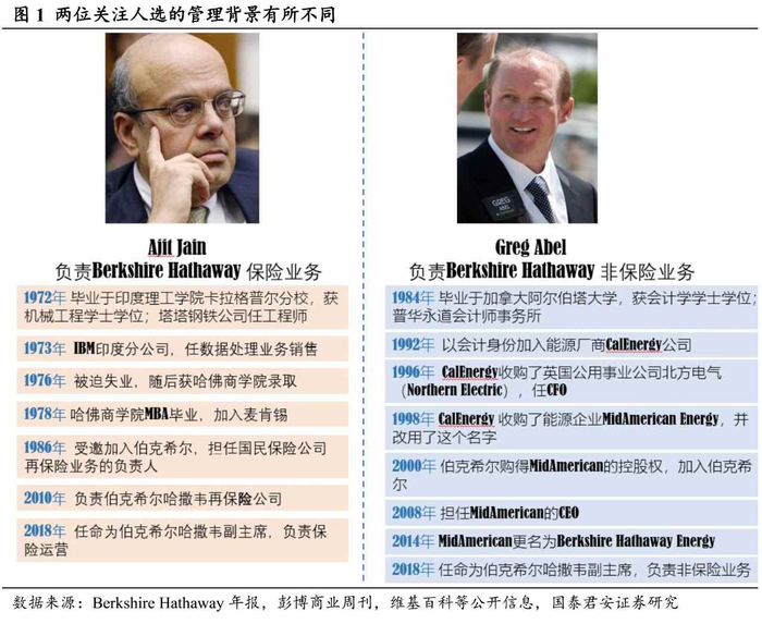 不同的专业背景和成长路径。Ajit Jain和Greg Abel分别是从伯克希尔的保险业务和能源业务发展起来的,两人不仅在年龄上相差约十岁,加入伯克希尔的方式也有所不同。Ajit Jain 今年68岁,出生于印度,持有机械工程学士学位以及哈佛大学MBA学位。1986年,AjitJain受到前上级Michael Goldberg的邀请而加入伯克希尔,开始接触保险业务。不就后,便开始担任当时规模小且处于困境之中的国民保险公司再保险业务负责人。Ajit Jain非常出色的使其成长为保险业界的巨头之一。巴菲特在2010年致股东的信中,提到“Ajit从零开始,创建了一家拥有300亿美元浮存金和巨额承保利润的保险公司,这是其他任何保险公司的首席执行官都无法匹敌的壮举”。2012年,Ajit Jain被任命为伯克希尔再保险业务总裁,而这项业务也为伯克希尔的投资业务带来了丰厚且低成本的资金。