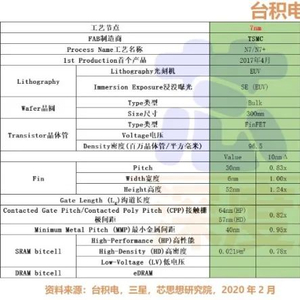 有两个工艺制程可选,一是针对AP(N7P),二是针对HPC(N7HP)。联发科天玑1000、苹果(AAPL.US)A13和高通(QCOM.US)骁龙865都是采用N7P工艺。 台积电第一个使用EUV方案的工艺是N7+。N7+于2018年8月进入风险生产阶段,2019年第三季开始量产,N7+的逻辑密度比N7提高15%至20%,同时降低功耗。