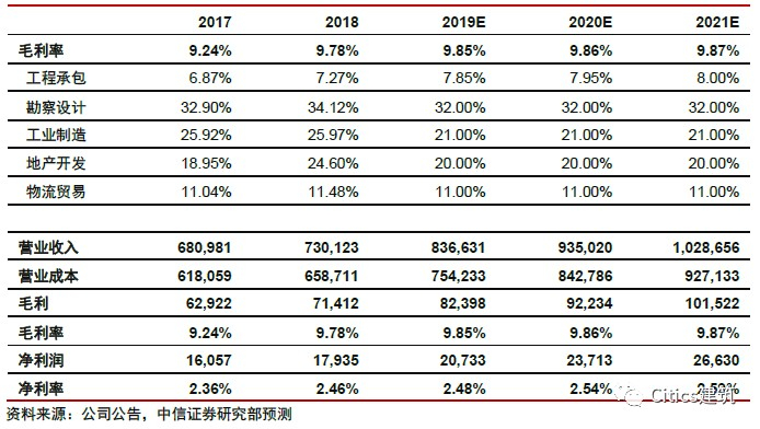 2. 收入增速:1)工程承包业务方面,考虑公司在手订单充足,随着在手订单的持续推进,预计2019-2021年收入增速分别为15%/12%/10%;2)勘察设计业务随着交通各领域“十四五”规划逐步出台,预计未来收入增速有所回升,预计2019-2021年收入增速为5%/10%/10%;3)工业制造业务较快拓展,2019-2021年收入增速为25%/10%/10%;4)此外预计其他业务板块保持稳健增长,地产/物流贸类业务未来三年增速分别为5%/10%。
