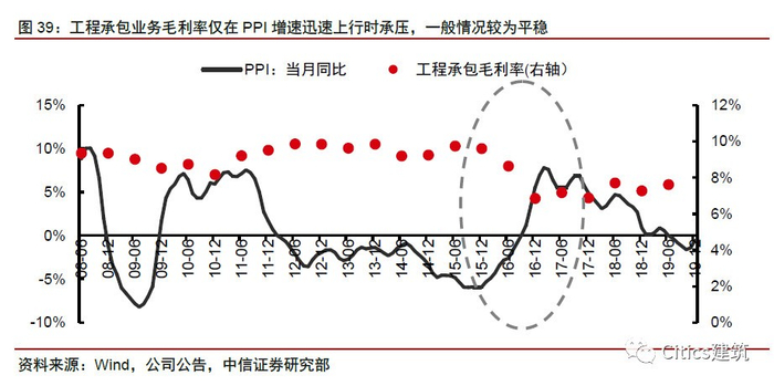 工程承包业务中市政、城轨等业务毛利率较高,而公路、铁路业务毛利率较低。根据我们调研结果,公司3Q19城轨和市政的毛利率较高(超10%),而3Q19公路/铁路毛利率约为9.0%/5.5%。铁路毛利率较低的原因为铁路领域业主主要为铁路总公司,而铁路总公司的议价能力较强;市政毛利率较高的原因为项目收益率高且市政项目采用PPP模式较多、PPP项目对内在收益率有一定要求所致。
