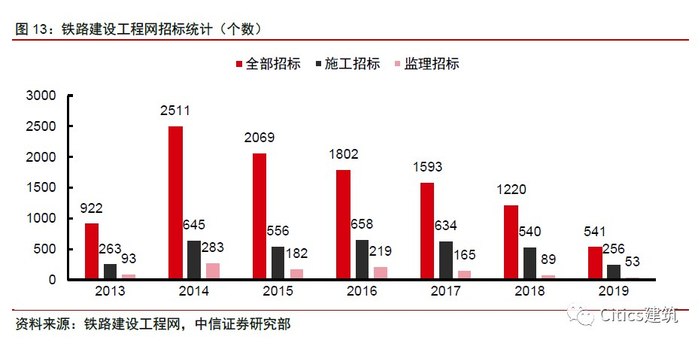 过去五年中2014-2015年的铁路招投标量处于高峰。除历史原因外,2014-2015年招标量的提升是因为铁总为“十三五”铁路建设提前释放项目,储备订单所致。2016-2019年铁路工程招标量呈下行趋势,从目前数据看,2019年铁路招标量处于过去五年的底部区域,我们认为,为“十四五”以及中长期铁路建设规划蓄力,预计2020年铁路招投标量有望逐步回暖。