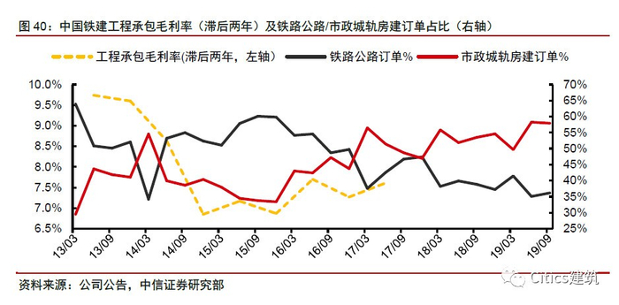 公司未披露工程承包业务各分部的收入比例,但工程承包业务各分部的订单比例可作为毛利率变化的指引。我们将工程承包毛利率(滞后两年)与铁路公路订单占比、市政城轨房建订单占比进行同期比较,工程承包毛利率随着市政城轨房建订单占比提升而提升。我们认为,随着近两年市政城轨房建订单占比继续提升(3Q19已达58%),预计未来两年工程承包毛利率料将处于向上改善通道。