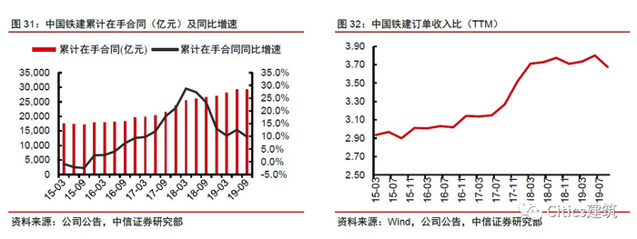 订单高保障,现金流修复,毛利率改善。1)公司2019订单逐季改善,2019新签同比+26.7%,其中工程新签同比+28%;公司3Q19未完合同29,446亿元,订单收入比已提升至4x左右高位,在稳基建政策支持下,充沛的在手订单将有序推进,支持业绩稳增。2)在资金成本趋于下降(1H19为5.06%)、经营效率提升以及加大回款催收力度下,公司3Q19年现金流已明显修复,我们预计2019年经营现金流将高于2019年净利润。3)随着近两年毛利率较高的市政城轨房建订单占比继续提升(3Q19已达58%),预计2020-2021年工程承包毛利率料将处于向上改善通道。
