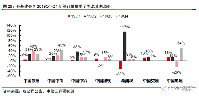2019年以来,公司订单增速逐季度改善。2019年公司新签订单20,069亿元,同比+26.7%;其中工程承包业务订单17,307亿元,同比+28.0%。自4Q18公司订单增速触底后,2019年以来公司订单增速逐季改善,2019年一至四季度累计同比增速分别为+6.3%/+18.0%/+25.1%/+26.7%,单季度看,Q1-Q4同比增速为+6%/+28%/+40%/+29%,订单增速在各大建筑央企中位列前列。
