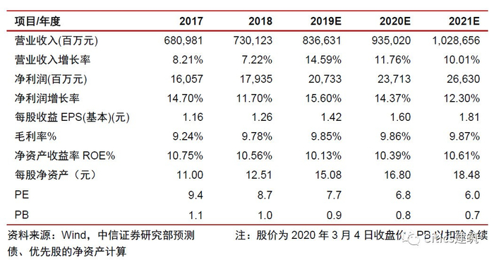 基于以上假设,经模型测算得出公司2019-2021年营业收入8,366/9,350/10,287亿元,归母净利润分别为207.3/237.1/266.3亿元,我们维持2019-21年盈利预测,对应EPS为1.42/1.60/1.81元。