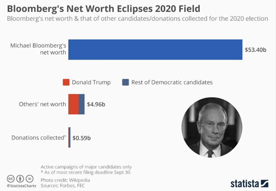据《纽约时报》报道,布隆伯格在他的三任纽约市长竞选活动中总共花费了至少2.68亿美元。但他加入总统争夺战引发了一个对敏感主题的讨论——是否能够拿钱买总统?