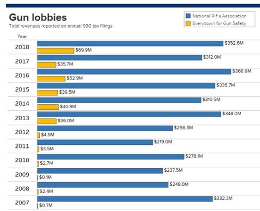 布隆伯格参与创建了一个枪支安全组织——全城枪支安全行动基金(Everytown for Gun Safety Action Fund),该组织强调在州一级对枪支安全进行倡导,并导致了枪支政策的巨大变化。十年多来,基金逐渐发展壮大,2018年收入翻番,是唯一有可能与美国最大的亲枪游说组织国家步枪协会(National Rifle Association)分庭抗礼的机构,这也说明了布隆伯格可能是唯一在枪支管理方面做出变革的人。