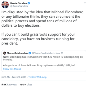 “我对布隆伯格或任何亿万富翁都认为他们可以绕过政治程序并花费数千万元购买选举结果的想法感到厌恶。”