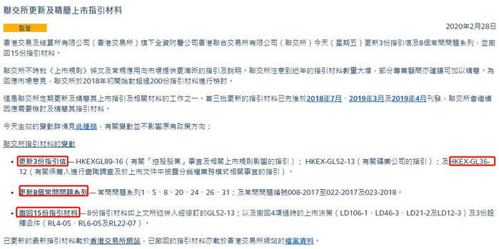 2月28日,香港交易及结算所有限公司(香港交易所)旗下全资附属公司香港联合交易所有限公司(联交所)更新3份指引信及8个常问问题系列,并撤回15份指引材料。