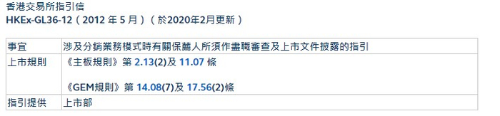 值得注意的是,在更新的3份指引信中,其中的一份为HKEX-GL36-12,即:有关保荐人进行尽职调查及于上市文件中披露分销权业务模式相关事宜的指引。