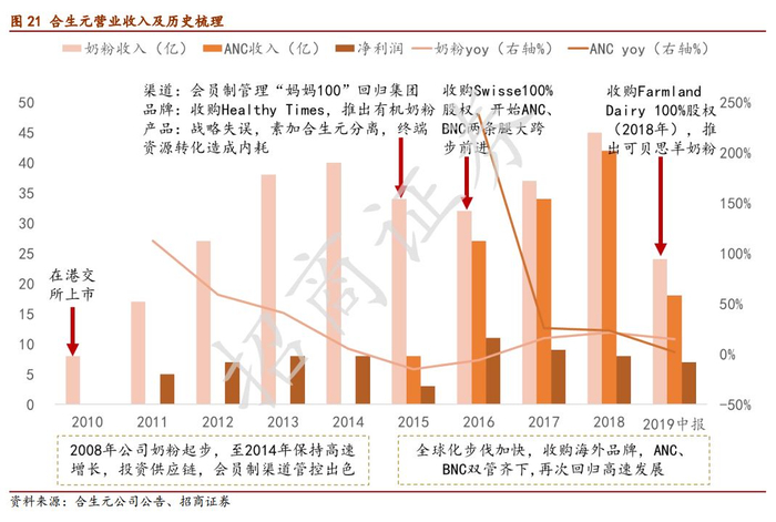 定位中高端,ANC、BNC双管齐下。公司产品定位较高高端,奶粉配方优质,生产技术领先,2018年,合生元婴幼儿配方奶粉产品的销售额增长18.9%,而旗下高端有机品牌HT销售额增速172%十分惊艳,近三年市占率稳步提升,接近5%。之前素加系列存在战略失误导致内耗,目前企业已经进行战略调整。切入羊奶粉市场,推出可贝思羊奶粉超高端产品,备受期待。2015年收购swisse,母婴与成人营养板块两条腿走路。