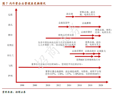 管理更换:决策的长期性助力内资企业反扑。外资是职业经理人管理,任职和考核期相对较短,决策相对短期。以雅培为例,从2016年至今,三年多时间换了三任中国区总经理,每任总经理都有自己的思路,培养团队和贯彻策略都需要一定的时间,从而导致政策缺乏延续性,销售团队和市场团队缺乏稳定性,阻碍企业渠道下沉、份额扩展等方面的深度持续挖掘。内资企业的管理层相对稳定,特别是飞鹤,公司核心管理层均在奶粉行业从业超过10年,董事长从业并任职与公司超过30年,拥有长远的战略眼光与优秀的执行力,在产业链布局、渠道推广、品牌定位上均先人一步,带领飞鹤成为中国市场第一国产奶粉品牌。