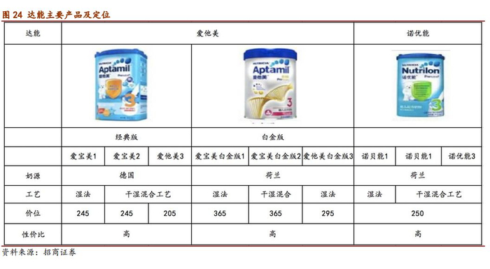 产品品牌:爱他美稳定发展,诺优能增长发力。旗下包含爱他美、诺优能定等品牌,爱他美以科学的产品配比为主要卖点,近年来做从经典到卓萃的产品升级;诺优能此前赞助《爸爸去哪儿》呈现较好成长,但近两年,缺乏高端发力点,增长压力较大。