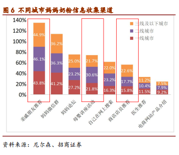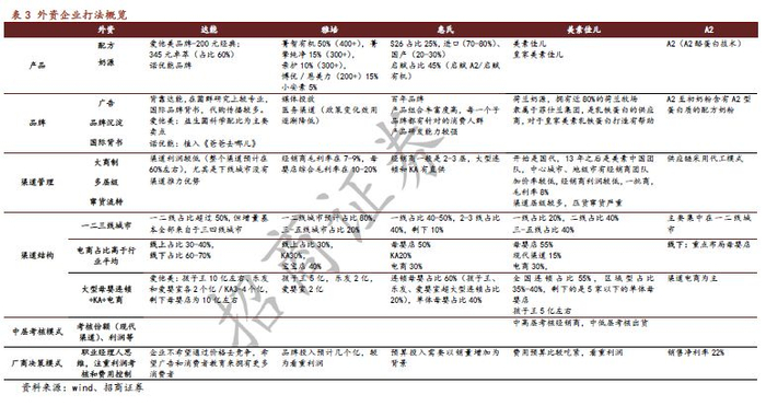 ② 渠道优势凸显,品牌劣势收窄。渠道来看,从人口出生的地域分布看,未来的主要竞争集中在三四线城市,国产品牌具有多年深耕地域市场的经验,利用人海战术集中力量抢占份额,靠费用补贴经销商等;而大外资的打法一般是投入到前端,很少投入大量资源和精力去广袤的三四线城市做品牌,导致在渠道下沉方面会有困难。因此,国产品牌具备渠道优势。且奶粉作为高端品,价盘管控非常重要,只有具备渠道优势和管理能力的企业,才能做到规模大和价盘稳共存,否则只能取其一。品牌来看,内资龙头从原来完全难以树立品牌的被动局面中脱离出来,从更新鲜、更适合中国宝宝体质等方面切入,品牌相对外资劣势收窄。更新鲜:原装原罐进口考虑通关时间后,可能新鲜度弱于国内品牌。更适合中国宝宝体质:内资龙头企业研发配方与母乳更相似、更适合中国宝宝体质的奶粉。这些配方致力于帮助宝宝更好的消化吸收。