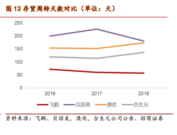 库存周转快于同行,星飞帆大单品支撑半边天。飞鹤靠大单品、强周转模式,突围奶粉行业。飞鹤产品中超高端星飞帆占比50%,高端超高端产品占比75%,通过高举高打的模式实现了快速扩张。飞鹤存货周转速度是内资龙头品牌中最快的,存货周转天数最近三年不断下降,2018年仅有57天。