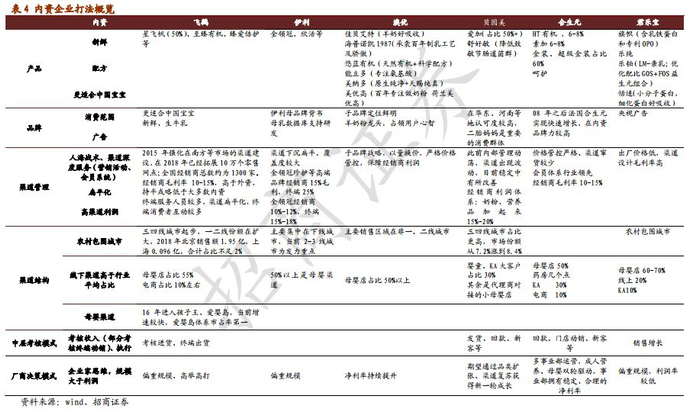 有品牌建设能力的内资企业有望出现。第一,品牌力是一个综合实力体现,过去消费者将安全属性作为极为集中关注点,现在配方、营养等也成为比较关注,内资不再成为一票否决的点,消费环境和行为转变,内资企业更容易通过其他方面去实现品牌建设。第二,以飞鹤、君乐宝为代表的内资企业,抓住外资由于压库存等行为导致的产品新鲜度较低的弱点,进行错位宣导,形成了独特的品牌印象点。第三,内资奶粉龙头更重视规模,在市场投入上较为激进。第四,渠道利润较高的情况下,利益群体可以帮助核心品牌实现快速的市场教育。