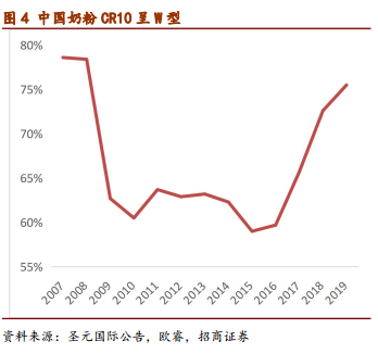 08年之前内资奶粉占据主导,且市场集中度较高。我们看到,除了少部分舶来品,在绝大多数领域内资企业都占据主导。奶粉行业在08年重大历史事前前夕,也是内资奶粉占据主体。国家统计局第十二届全国市场销量领先品牌信息发布会公布,2007年三鹿奶粉市占率为18.26%,连续15年居全国同行业销量第一名,且比二三名高出5.68%和9.43%。三鹿在2007年的时候达到100亿(新闻数据,按照常规口径折算出厂口径70亿左右),根据我们的测算,外资前九大龙头合计出厂口径尚不足70亿,三鹿的龙头地位当之无愧。根据圣元的公告,2007年,CR10占比达到70%以上,市场集中度较高。