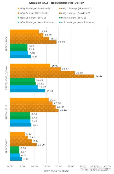 如果将结果转换为固定的每美元吞吐量,我们将再次看到Graviton2遥遥领先。这里的单位是SPEC每1美元运行。