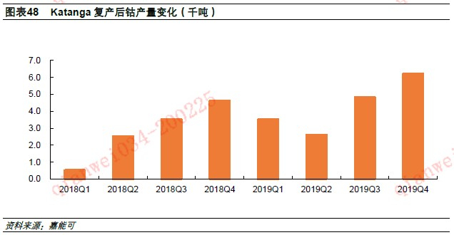 Katanga作为嘉能可钴产量新增主要项目,设计产能较大,对全球钴供给具有较大影响。但Katanga 2018年复产以来,受各种原因困扰,产能释放并不顺利。2018年底Katanga钴产品被发现发射性元素铀超标,销售暂停。直到2019年4月,公司通过工艺调整,产出钴产品铀含量符合监管的要求,才开始恢复销售,但需接受刚果(金)原子能机构以及相关部门的监督。另外,2019年由于一台钴干燥设备维护,公司面临干燥能力不足问题,根据计划,2020年二季度后,Katanga干燥设备将正常运行,干燥环节瓶颈将得以突破。
