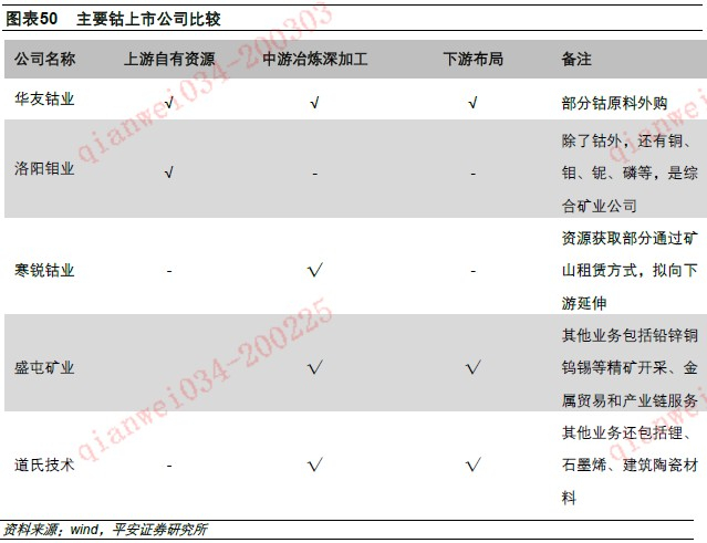 目前钴的上市公司主要包括华友钴业、寒锐钴业、洛阳钼业(03993)、盛屯矿业、道氏技术五家,建议关注钴相关业务占比高、规模突出、积极布局下游产业链的龙头公司华友钴业、寒锐钴业。