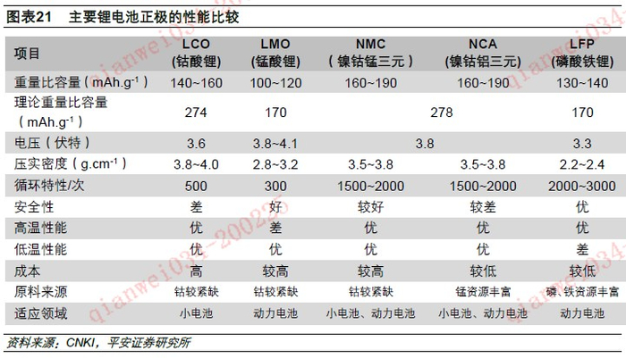 而在动力电池应用的三种主流材料中,锰酸锂尽管原料来源丰富、成本较低,安全性能好,但存在重量容量密度较低,与电解质相容性不佳,深度充放电电池容量下降较快等缺点,限制了其在动力领域的应用。目前动力电池应用最多的材料是磷酸铁锂和三元材料,相对而言,磷酸铁锂安全性、循环性能及成本优势都很突出,但理论重量能量容量较低,振实密度较低、低温性能较差;而三元材料重量能量密度高,高低温性能较好,但安全性相比磷酸铁锂差,使用钴原料成本也较高。基于能量密度考虑,动力电池正极材料逐步向三元材料倾斜。随着比亚迪“刀片电池”产品推出,磷酸铁锂电池能量密度特别是体积能量密度得到极大提升,重新吸引了市场关注。为此,我们对“刀片电池”和三元体系电池做重点分析。
