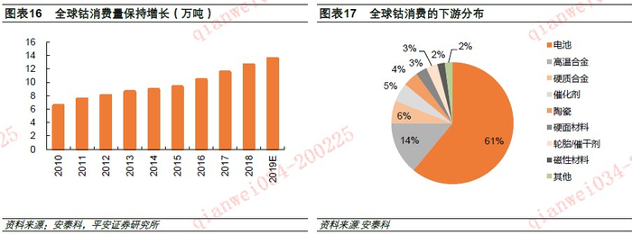 根据安泰科,2018年全球钴的需求量为13.5万吨,2010年以来的复合增速为8.6%;中国钴的需求量为6.5万吨,2010年以来的复合增速为14.8%。且2017年以来,随着新能源汽车拉动的显现,需求增长相较之前加速。