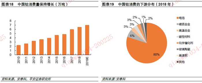 人类早在公元前2000年前就开始使用钴作为着色剂,中国自唐代起也将钴作为陶瓷生产着色剂,但应用领域一直没有大的拓展。20世纪起,随着工业的发展,尤其是近30年以来,钴高硬度、耐高温、耐磨等优异的性能才得以发掘,被广泛应用于电池、高温合金、硬质合金、催化剂等领域,成为重要不可或缺的金属材料。在新能源汽车电池领域,添加钴的三元材料,能提高电池安全性和循环寿命,目前也是不可完全替代的原料。