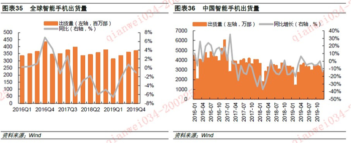 (2)3C手机领域,5G推动,2020年起恢复增长。手机是3C最重要的产品,2016年以来随着智能手机渗透率提升以及换机周期延长,全球智能手机出货量增长低迷。2019年起5G手机进入市场导入期,各手机厂商积极推出5G手机,其中,红米K30更是将5G手机的价格打入了2000元区间,它的发布意味着5G手机正式具备了普及化的能力。我们预计随着5G基站布局逐步完善以及5G新机型推出,智能手机换机需求将得以激活,短期智能手机可能受疫情影响,但2020年起全球智能手机出货量有望恢复增长可能性较高。