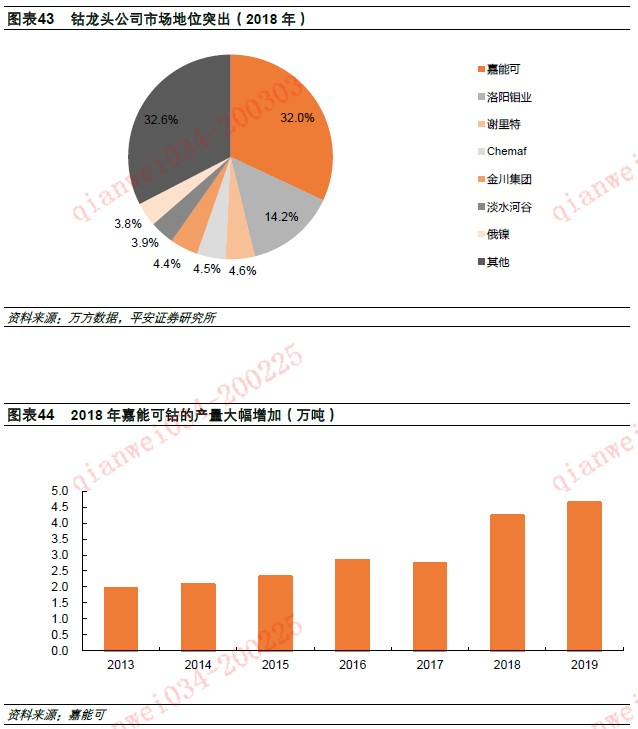 钴矿资源供给区域以及龙头企业的集中度高,其中刚果(金)处于核心地位,钴资源储量及钴矿产量在全球的占比均超50%;钴矿生产主体方面,尽管2018年以来,全球有较多钴矿项目投产,但主要集中在刚果(金)的铜钴资源,且龙头公司是扩产主体,最主要的项目包括嘉能可2018年技改复产的Katanga年产3万吨钴项目以及欧亚资源2018年底投产RTR一期1.4万吨钴项目,其他项目主要是一些中资企业在刚果(金)铜钴项目。因此,钴供给主体市场结构并没有发生重大变化,龙头公司市场占有率高,根据我们估算,嘉能可和洛阳钼业2018年在全球钴矿市场占有率高达32%和14%,其他公司市占率多在5%以下,龙头公司尤其是嘉能可具有较强的话语权。