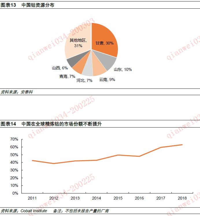 中国钴资源较为缺乏,储量仅为8万吨钴金属量,在全球陆地钴资源量的占比约1.4%。中国钴资源量约70万吨,在全球占比也不到3%。在区域分布上,中国70%钴资源分布在甘肃、山东、云南、青海、山西六个省份,其中甘肃以30%份额位居全国第一。但中国钴资源存在着品位低,分离难度较高等问题。