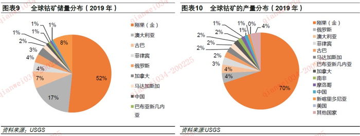 根据美国地质调查局(USGS),近年来,全球陆地钴的储量基本稳定,约为700万吨,而钴资源量为2500万吨。但区域分布却十分集中,其中刚果(金)在全球钴储量的占比为52%,澳大利亚和古巴分列第二和第三位,在全球钴储量的份额分别为17%和7%,其他国家和地区储量占比则较低。和钴储量分布相似,全球钴矿的产量集中度也很高,资源储量最丰富的刚果(金)占全球镍矿产量的70%,其他国家钴矿产量占比多在5%以下。无论是储量还是钴矿产量方面,刚果(金)在全球均处于中心地位。