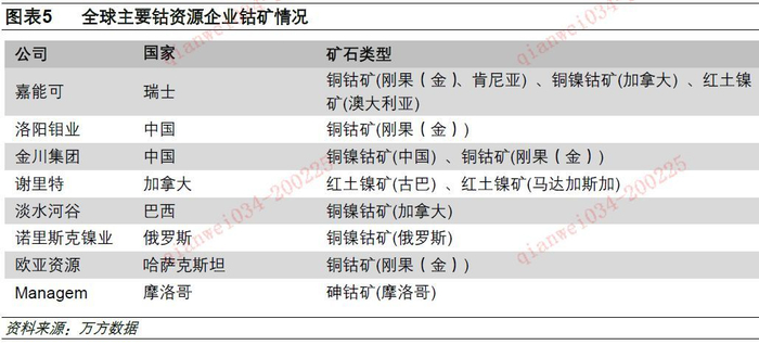 钴在地壳中的含量较低,丰度仅为0.0025%,且大部分呈分散状态,多以伴生矿的形式出现,目前全球主要的钴矿项目中,仅有摩洛哥Managem下属的Bou Azzer钴矿以钴为主产品。在全球钴的生产中,铜伴生和镍伴生钴产量占比分别为73%和25%,而原生矿及其他占比则不到2%。由于钴伴生矿的特征,因此全球知名的钴资源企业中如嘉能可、洛阳钼业、谢里特、淡水河谷等,大部分同时也为铜或镍重要生产商。