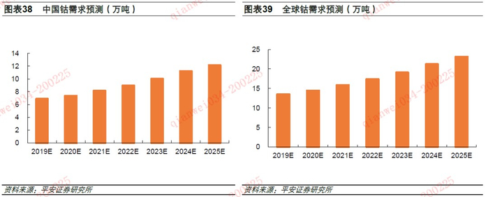 我们预计全球钴需求量将从2019年的13.5万吨提高到2025年的23.1万吨,年复合增速为9.4%;中国钴需求量将从2019年的6.9万吨提高到2025年的12.2万吨,年复合增速为9.9%。