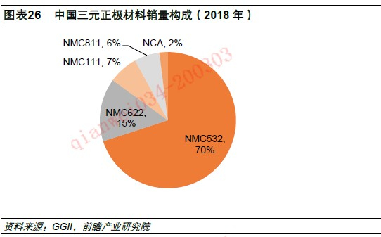 根据GGII(高工产研),2014年三元正极材料在中国正极材料出货量占比不断提升,由2014年的约30%提高到2019年的约48%,成为第一大正极材料。而在三元正极材料细分产品上,NMC532在正极材料销量占比最高,为70%,NMC 622次之,为15%,而NMC 811和NCA 占比相对较低,同时我们也 注意到低镍的NMC111电池能量密度较低,占比也不大。我们认为,NMC622、NMC 811和NCA技术门槛较高,是导致其短期市场占有率较低的原因。随着技术进步,高镍的NMC622、NMC811和NCA三元材料未来市占率提升空间大。