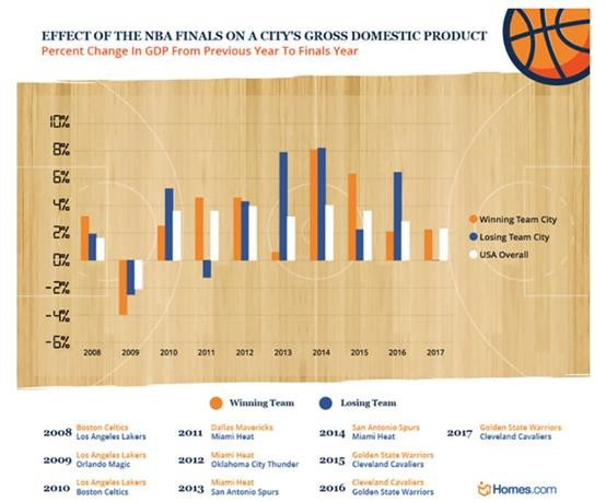 有趣的是,总决赛的输家的城市也有6次高于全美平均水平, 这证明有时只是接近最终冠军,也可以对经济做出贡献。
