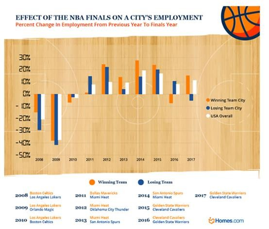 美国国家劳工委员会(National Labor Board)每年公布的总决赛主办城市的就业率数据,然后将它们参加总决赛的那一年的数据与参加总决赛前一年的数据进行了比较。数据分析可以发现在过去的10多年里,超过90%举办总决赛的城市可以看到就业增加超过整个美国平均水平。
