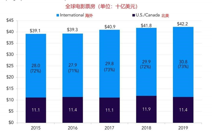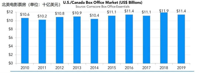 院线市场的增速在放缓,甚至像美国这样发达市场已经出现了事实上的大幅下滑。根据《报告》,2019年美国电影总票房114亿美元,较前一年下滑4%,售出电影票12.4亿张,下滑5%。