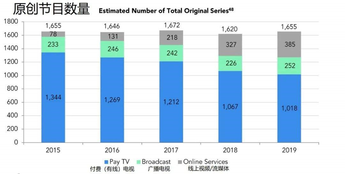 在流媒体原创节目快速增长的同时,我们看到有线电视的原创节目在大大减少,从2015年的1344档原创缩减到了1018档,5年时间少了326档节目。