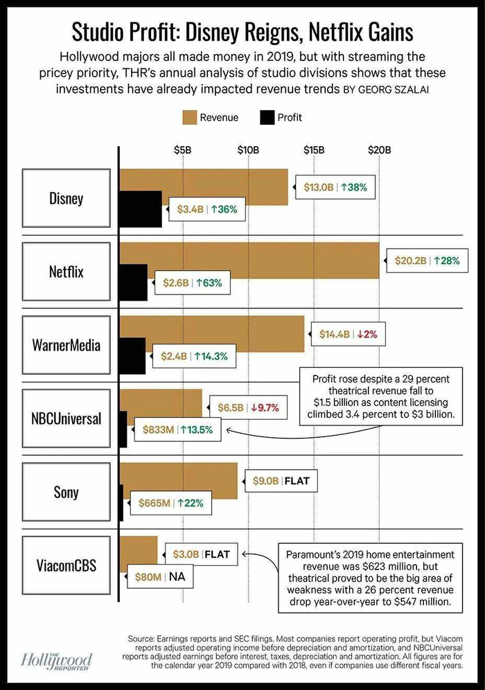 流媒体不仅革了院线的命,也为好莱坞带来了结构性的变化。根据Hollywood Reporter发布的好莱坞六大影视内容收入统计表,像环球和派拉蒙这样的好莱坞百年老店,票房收入已经远低于内容授权的收入。前者的院线收入只有15亿美元,而内容授权收入超过30亿美元;后者院线收入只有5.47亿美元,但家庭娱乐(包括流媒体、DVD等)收入达6.23亿美元。