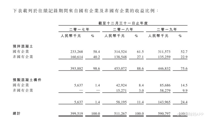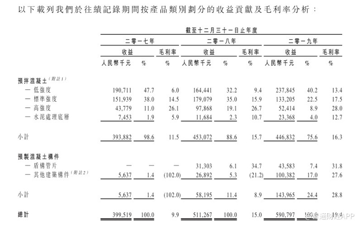 其中,预拌混凝土业务作为主要收入来源,一直维持着稳定的个位数年增长。期间,收入分分别约为3.94亿元、4.53亿元和4.47亿元,年复合增长率为6.5%。不过,随着预制混凝土构件收入快速增长,预拌混凝土于总收入的贡献比已由98.6%下降至75.6%。