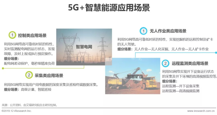 5G+智慧能源5G助力智慧能源发展,实现能源的可持续利用智慧能源,即能源行业的自动化与智能化,主要包括智慧电网与智慧矿山两大应用场景。电力系统由发电、输电、配电、变电及用电五大环节组成,不同环节对网络的需求各异。目前,电力通信网主要由光纤覆盖,但随着智慧电网的发展,光纤已无法满足电力行业的发展需求。智慧电网主要分为控制与采集两类细分应用场景,5G既能满足控制类应用场景对低时延的需求,又能满足采集类应用场景对大带宽及大连接的需求,将极大的推动智慧电网的发展。矿山环境复杂,人工现场作业危险系数高,效率低。矿山的无人化是未来矿山发展的必然趋势。智慧矿山包括远程监测与无人作业两类应用场景。4G网络的性能无法满足智慧矿山的发展需求,5G既能满足远程监测类应用对大带宽的需求,又能满足无人化作业对低时延的需求,将助力智慧矿山的发展。整体来看,5G大带宽、高可靠低时延及大连接的特性,将助力智慧能源的发展,实现能源的可持续利用。